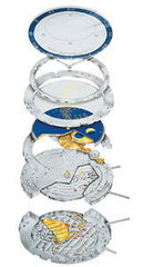 Астрономические часы: от указателя фазы Луны до наручного планетария. Часть 1 С самых древних времён развитие науки измерения времени шло вместе с развитием астрономии. Первые часы создала природа: ежедневное чередование дня и ночи, движение Солнца по небосводу, эволюция фазы Луны... Первыми часами было Солнце, первым календарём Луна, Этих природных "часов" в течение долгого времени вполне хватало нашим предкам, до тех пор, пока не стала развиваться городская цивилизация с городским темпом жизни, недостатком свободного времени и необходимостью заранее планировать свои дела, Так получилось, что бурное развитие городов примерно совпало по времени с развитием технологии механических измерителей времени устройств, которые могли при тогдашнем уровне технологии обеспечить достаточные равномерность и точность отсчёта времени. Когда небесные тела стали постепенно утрачивать доминирующую роль в измерении времени, ситуация повернулась в обратную сторону: теперь уже часовые мастера многих веков стали стараться отобразить их движение по небосводу на циферблатах сложных и не очень сложных механизмов. Астрономия и измерение времени С самых древних времён развитие науки измерения времени шло вместе с развитием астрономии. Первые часы создала природа: ежедневное чередование дня и ночи, движение Солнца по небосводу, эволюция фазы Луны... Первыми часами было Солнце, первым календарём Луна, Этих природных "часов" в течение долгого времени вполне хватало нашим предкам, до тех пор, пока не стала развиваться городская цивилизация с городским темпом жизни, недостатком свободного времени и необходимостью заранее планировать свои дела, Так получилось, что бурное развитие городов примерно совпало по времени с развитием технологии механических измерителей времени устройств, которые могли при тогдашнем уровне технологии обеспечить достаточные равномерность и точность отсчёта времени. Когда небесные тела стали постепенно утрачивать доминирующую роль в измерении времени, ситуация повернулась в обратную сторону: теперь уже часовые мастера многих веков стали стараться отобразить их движение по небосводу на циферблатах сложных и не очень сложных механизмов. Знание "расписания" астрономических явлений, в основном это смена фаз Луны, по-видимому, имело большое практическое значение до начала XX века, и не только из-за календаря религиозных событий, в значительной степени ориентированных на чередование лунных месяцев, наследие тех времён, когда религии были молоды. Земледелие и мореходство в древности, очевидно, тоже ориентировались на Луну. Не нужно забывать и астрологию. Наверное, благодаря всему этому астрономические функции не исчезли с циферблатов часов. Астрономические часы Обычные часы показывают поясное среднее солнечное время и поэтому, вообще говоря, не могут называться астрономическими. Астрономическими принято называть те часы, которые в той или иной форме отображают реальное движение небесных светил. Диапазон современных астрономических часов очень широк: от простого указателя фазы Луны до крайне сложных моделей со многими астрономическими функциями. Данный обзор посвящён только механическим часам. Какие из астрономических объектов можно найти на циферблатах астрономических часов? Ответ на этот вопрос Вы найдёте в 