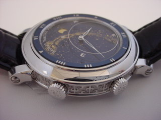 В октябре 2000 года Patek Philippe представил публике Star Caliber 2000, одни из самых сложных карманных часов в истории, с поражающим воображение набором астрономических функций. Это были первые в мире часы, которые отображали точную конфигурацию ночного неба с видимым движением звезд, положением луны и ее сменяющимися фазами в течение лунного цикла. Через шесть месяцев мастера Patek Philippe представили Sky Moon Tourbillon Ref. 5002 сложнейшие наручные часы, для создания которых механику астрономических функций пришлось уменьшить и интегрировать дисплей со звездным небом на оборотную сторону корпуса. Вложение 62434 Небесный свод можно наблюдать на циферблате на лицевой стороне часов. Эти часы включают в себя самые необычные функции для наручных часов. Небосвод Северного полушария вращается против часовой стрелки, показывая угловое смещение звезд относительно меридиана Сириуса. В то же время отображается меридиан и фазы Луны. Две центральные стрелки показывают часы и минуты стандартного времени на циферблате с римскими цифрами. Комплексный астрономический дисплей состоит из системы наложенных друг на друга сапфировых дисков, которые вращаются с различной скоростью и создают гипнотическое впечатление глубины. Основа дисплея синий сапфировый диск, управляемый колесом с 279 зубьями. Этот диск воспроизводит орбиту Луны. Через планетарную зубчатую передачу он также управляет дополнительным сапфировым диском, показывающим рост или убывание луны в маленькой круглой апертуре. Над ним, в колесе с 356 зубьями, лежит прозрачный сапфировой диск, на котором с одной стороны изображена карта звездного неба, а с другой стороны галактика Млечный Путь. Эти три диска защищены сапфировом стеклом с нанесенным внутри эллипсом, который ограничивает участок звездного неба, видимый из Женевы, таким образом, эта карта актуальна для широт от северной границы США до южного Средиземноморья. Эта система защищена швейцарским патентом CH 688 171 B5. Вложение 62435 Инновационный механизм часов Sky Moon показывает поразительную степень точности для астрономических часов. - лунные сутки показывают ошибку 0,05 сек / сутки, 18,385 сек / год, или 30 мин и 38,5 сек за сто лет; - звездные сутки точны до 0,088 сек / сутки, 32,139 сек / год, или 53 мин и 33,9 сек за сто лет; - указатель фаз луны дает ошибку в 6,51 сек за лунный месяц. Автоматический механизм часов Sky Moon это шедевр точной микромеханики, состоящий из 301 детали, скрупулезно обработанных вручную. Грани все стальных компонентов скошены и полированы, каждый зуб каждого колеса вручную отполирован твердым деревом. И это не просто совершенство ради совершенства столь высокая степень обработки снижает трение в точках соприкосновения колес и обеспечивает высочайшую степень точности и долговечности качества, которым марка Patek Philippe обязана своей безупречной репутацией. Платина обработана круговым зернением с обеих сторон, мосты гильошированы. Из-за этих сложных операций и многочисленных проверок, требуемых в процессе сборки, изготовление каждого механизма занимает несколько месяцев. В результате безукоризненный механизм, по праву несущий Женевскую Печать как официальный знак соответствия высочайшим стандартам качества механических часов. Автоматический механизм получает энергию от мини-ротора, смещенного от центра. Даже легких движений руки достаточно для полу