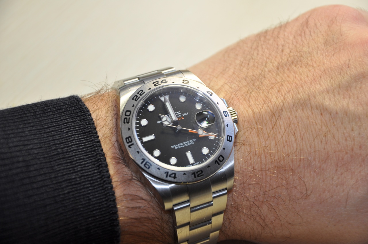 Наконец-то и я стал обладателем превого Ролекса. Путь был неблизким, т.к. за те пару лет, что увлекаюсь темой, возникали разные чувства, от сильного желания обладать часами этой марки до их полного неприятия. Но лучше один раз попробовать самому, чем слушать бесконечные мнения других. Возникшая в летних часах на браслете необходимость совпала по времени с очередным ДР. Как нельзя кстати пришелся выход новой модели Эксплорера, которая очень понравилась, в первую очередь размером. Покупал часы в Голландии, именно эта покупка и стала причиной поездки в Амстердам. выбирал из Суба, Дипси и собственно нового Эксплорера. Лучше всех сели 42 мм. Кроме того приглянулись новые крупные белые метки и стрелки, которые вкупе с красными стрелкой и надписью Explorer II, а также светлым матовым безелем делают эту модель очень даже нарядной и по-летнему веселой. Большим плюсом также считаю все те же сатинированные поверхности корпуса и браслета, благодаря им, часы смотрятся достаточно гармонично и почти не царапаются. В общем доволен! Очень!