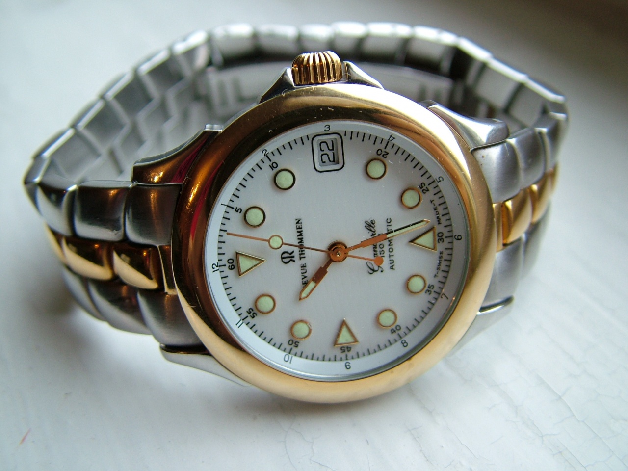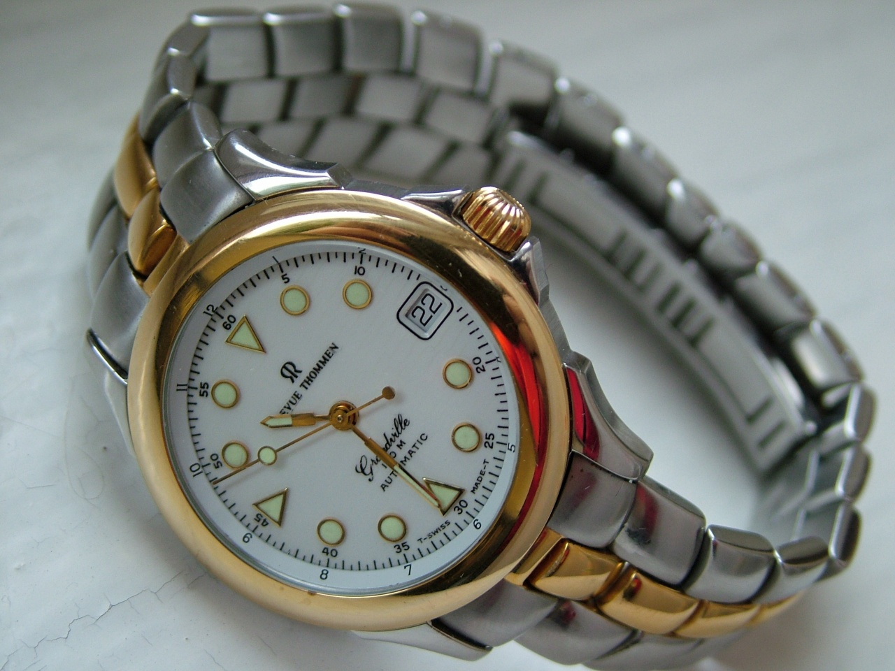 Корпус и браслет-сталь-биколор,покрытие 10 микрон,диаметр 34 мм. Навинчивающаяся заводная головка. Стекло-минеральное. Задняя крышка с прозрачным окном. Водонепроницаемость-150 м. Механизм-автоматический ETA 2892-A2. Куплены у официального дилера в 2005 г.,состояние хорошее.Снятые звенья прилагаются. Инструкция и коробка отсутствуют. Цена-10 тыс. руб. Вложение 186380 Вложение 186381 Вложение 186382 |