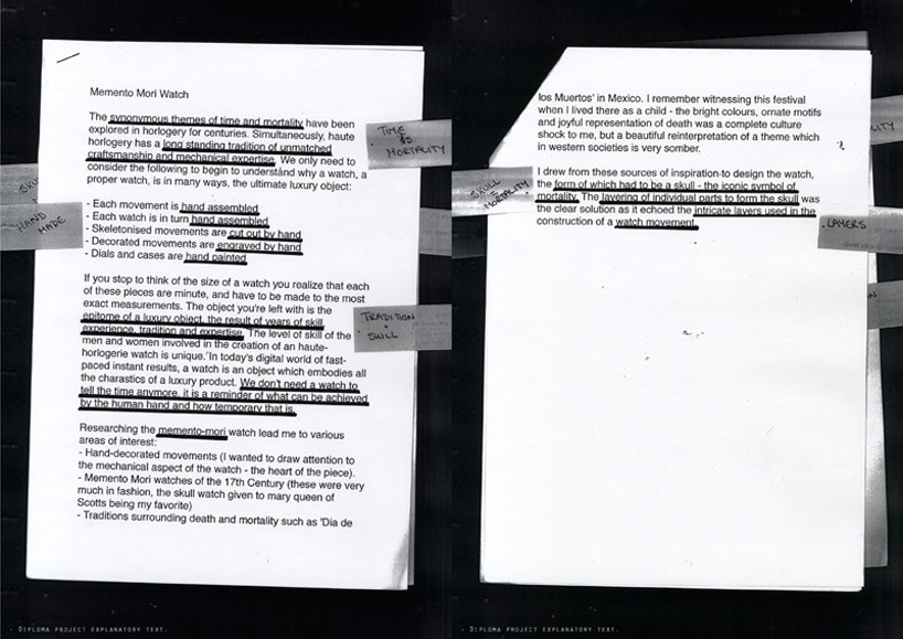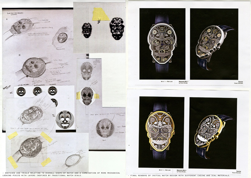 Студентка Университета искусства и дизайна Лозанны Фиона Крюгер (Fiona Krüger) в качестве выпускной работы создала часы. Они посвящены мексиканскому празднику, который называется «День Мертвых» (Dia de Los Muertos). Корпус модели сделан в форме черепа. Циферблата как такового нет, вместо него видны платины и мосты скелетонизированного механизма. Часы называются Memento Mori, что с латинского переводится как «помни о смерти». Все декоративные работы выполнены вручную. Модель создана пока в единственном экземпляре.