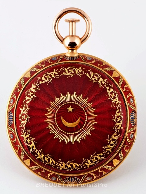 Эта модель была заказана в 1807 году Его Превосходительством Эссейдом Али Эффенди (Esseid Ali Effendi), бывшим послом Турции в Париже и личным другом Абрахамом-Луи Бреге. Именно благодаря этому знакомству, глава знаменитого часового Дома получил выход на перспективный турецкий рынок. Модель Breguet № 1090 Grande Complication, приобретенная для музея бренда, имеет четвертной репетир с независимыми Grande и Petite Sonnerie. Корпус круглый двойной, покрытый эмалевым красно-золотым узором в восточном турецком стиле. На белом циферблате, в качестве часовых индексов использованы старинные арабские цифры. Теперь эти часы станут частью экспозиции музея часовой компании Breguet, который располагается в Париже, на Вандомской площади над знаменитым бутиком марки. Модель будет выставлена в течение следующих нескольких недель - скорее всего уже в новом году. Источник: http://forums.timezone.com/index.php...=5966551&rid=0 |