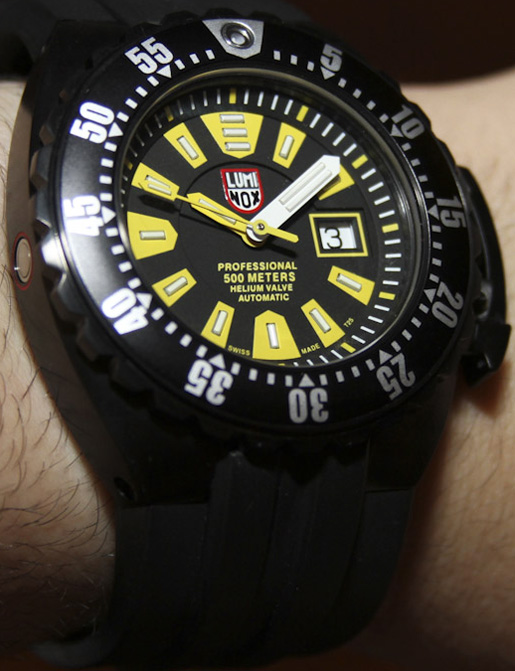 Новая дайверская модель Deep Dive Automatic 1500 Series от часового бренда Luminox имеет круглый корпус из нержавеющей стали 316L с черным PVD-покрытием, диаметром 44 мм, водонепроницаемый до 500 метров. Гелиевый клапан на 9 часах. Вращающийся однонаправленный дайверский безель с запатентованной системой блокировки, предохраняющей его от случайных поворотов. На лицевой стороне корпуса расположено сапфировое стекло с двусторонним антибликовым покрытием. Циферблат черный, с контрастными крупными желтыми часовыми индексами и стрелками с микротрубочками (всего их 17), наполненными газообразным тритием, что обеспечивает их постоянное свечение без необходимости периодической "фотоподзарядки".