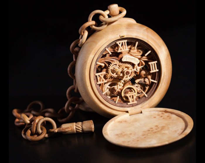 Свои первые карманные часы Валерий Даневич изготовил в 2008 году. Корпус диаметром 55 мм он выточил из березы. Механизм состоит из 13 колес, анкерного колеса, анкерной вилки, приводного барабана с металлической пружиной, колеса баланса с металлической спиралью; все это смонтировано на одной круглой платине и 5 мостах. Все колеса – березовые, мосты сделаны из черешни и клена, оси – из груши и бамбука. Циферблат кленовый, а стрелки и часовые индексы – из красного дерева. К корпусу крепится кленовая цепочка с ключиком, который служит для подзавода часов и перевода стрелок. Время завода составляет 15 часов.