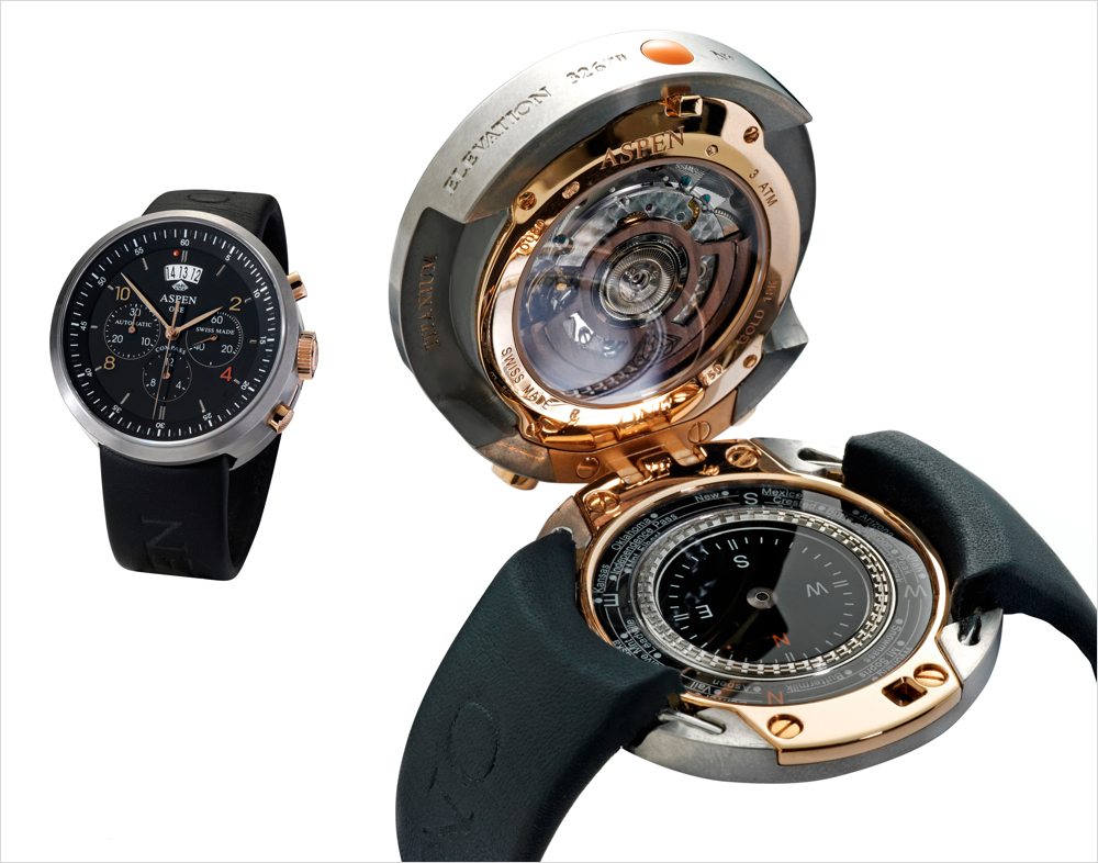 Круглый комбинированный корпус, внешняя поверхность которого выполнена из титана, а внутренняя (включая заводную головку и кнопки хронографа) из 18-каратного розового золота, диаметром 45 мм, водонепроницаемый до 30 метров. Корпус раскрывается на две части: верхнюю, в которой находится часовой механизм и нижнюю, с компасом, на котором обозначены окрестностей горы Aspen. На обеих сторонах верхней части корпуса, а также на верхней поверхности нижнего, установлены сапфировые стекла. Циферблат матово-черный, с накладными арабскими цифрами и стрелками из 18-каратного розового золота.