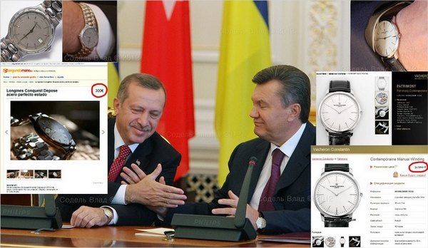 Президент Украины Виктор Янукович носит швейцарские часы, стоимость которых в сто раз превышает стоимость часов турецкого премьера Эрдогана. Об этом написал фотограф Влад Содель на своей странице в социальной сети. В подтверждение своих слов он привел фотографии. Дорогой аксессуар Янукович "засветил" во время встречи с премьер-министром Турции Реджепом Тайипом Эрдоганом. На руке Президента Украины красовались платиновые часы Vacheron Constantin.
