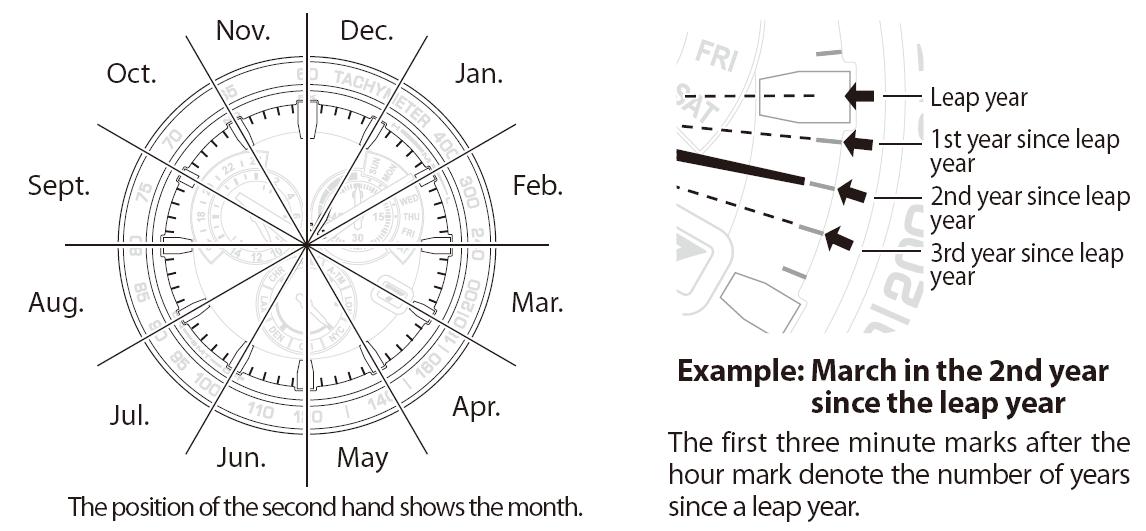 Во всех этих режимах (LON, LAX, DEN, CHI, NYC) можно настроить время и календарь. ЗГ выдвигаем в положение 2. Нажимаем нижнюю кнопку (А), секундная стрелка становиться в положение 12 часов. Теперь можно прокручивая ЗГ настроить необходимое время (часы и минуты). После этого, если снова нажать нижнюю кнопку (А) функциональная стрелка сделает некоторые движения. Теперь, прокручивая ЗГ можно выставить необходимое число. Выставили? Двигаемся дальше. Снова нажимаем нижнюю кнопку (А) и секундная стрелка после некоторых движений остановиться в том или ином положении. Указывая на месяц, выставленный в часах. Как определить что за месяц, какого года указан на часах – смотрим картинку и . Выставили? Теперь снова нажимаем нижнюю кнопку (А) и выставляем необходимый день недели.