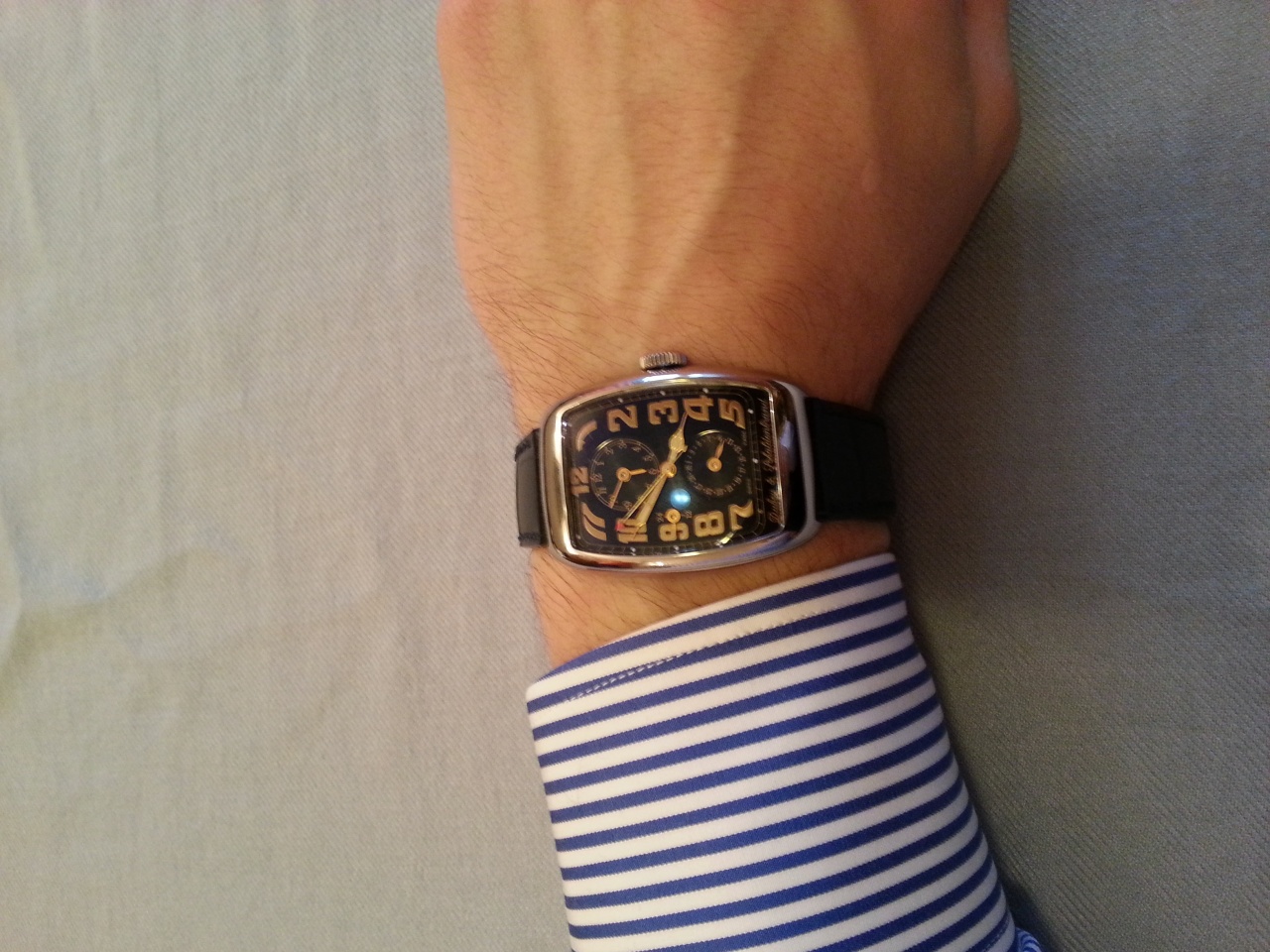 На фото не получилось, но цвет циферблата между черным и темно-синим, соответственно ремешок подобрал такой же, аллигатор, между черным и темно-синим.