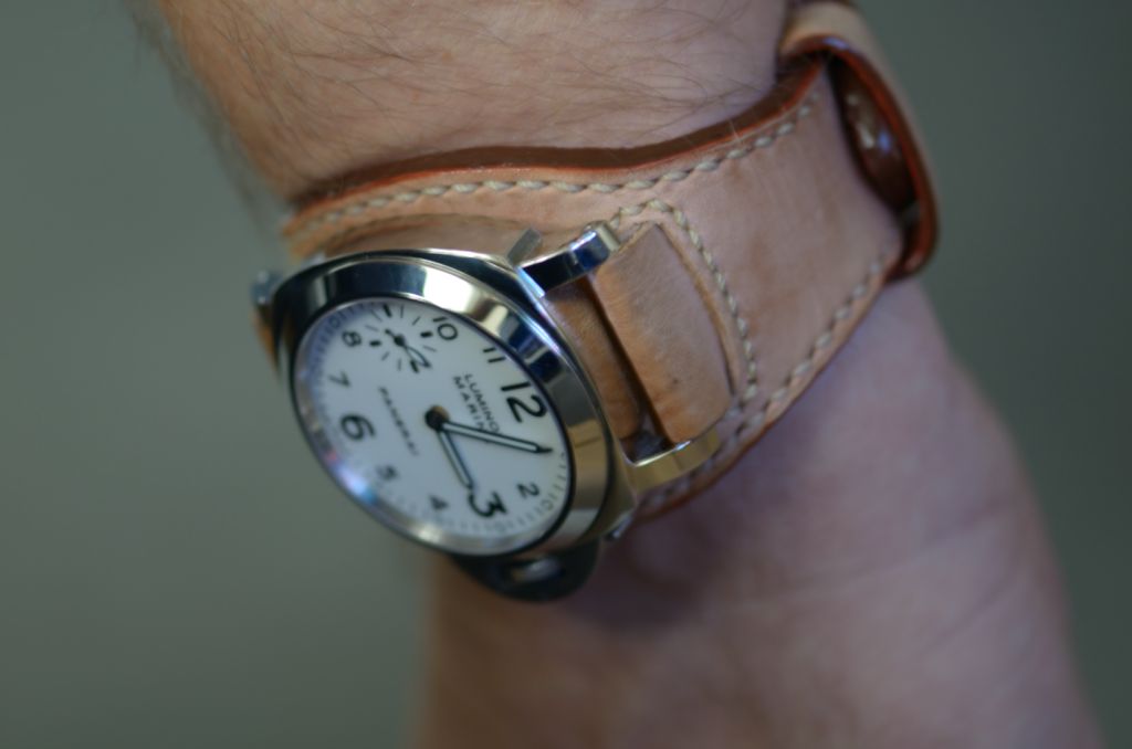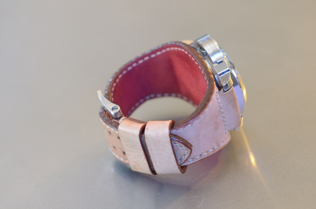 Как-то, при встрече с Роландом, обратил внимание на его ремень. Красивого медового цвета. На его "взрослом" запястье смотрелся красиво. Попросил такой же. Опуская перипетии с пошивом, настал день когда получил. Смешанное чувство. Вместо медового волшебного цвета ремня, я получил на руки страп цвета "бедра испуганной нимфы" (цитирую супругу). На мое недоумение Роланд дал сухой комментарий: носи и жди.