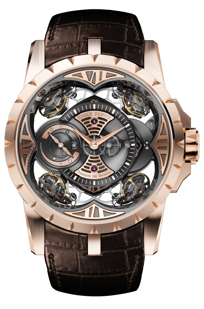 Excalibur Quatuor, эмблематическое свидетельство творческого гения Roger Dubuis, сохраняет все культовые особенности фирменного дизайна. С первых эскизов будущей модели и до ее презентации на салоне SIHH 2013 часовщики, инженеры и дизайнеры объединяли свои усилия, задействовав весь накопленный опыт Мануфактуры.