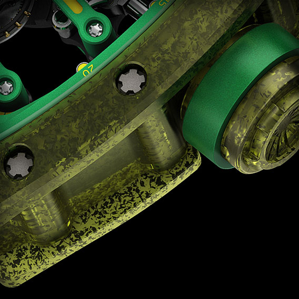 Мосты механизма напоминают лапы чудовища. Этот элемент механизма изготовлен из сплава алюминия, магния, кремния и свинца. Мосты поддерживают клеть турбийона и являются неотъемлемой частью модели вцелом. Richard Mille RM 59-01 "Yohan Blake" Tourbillon выпущены ограниченной серией 50 штук.