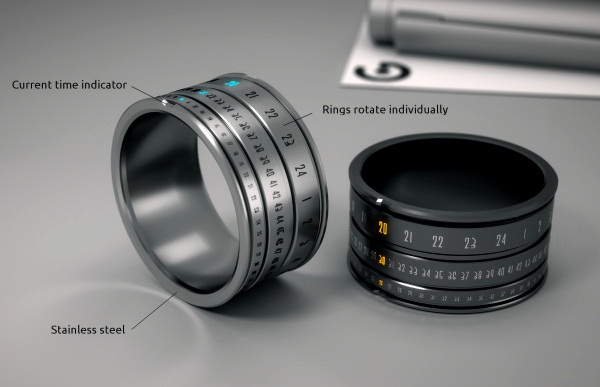 Ring Clock, сделанное из нержавеющей стали, показывает текущее время. Поэтому формально это не одно кольцо, а целых три: для отображения часов, минут и секунд. Самая широкая полоса - это часы, самая тонкая - секунды, а в серединке - кольцо для отображения бегущих минут. Цифры на всех трех кольцах подсвечены ярким цветным огоньком, чтобы удобнее определять текущее время. Цвет огонька может быть желтым, голубым, оранжевым, ну или же любым другим, по выбору обладателя стильного гаджета-украшения.