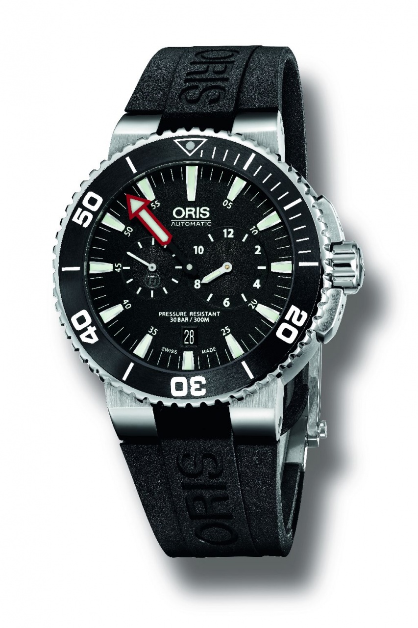 Новая дайверская модель Aquis Regulateur "Der Meistertaucher" (Ref. No. 749 7677 7154) от швейцарской часовой компании ORIS имеет круглый титановый корпус, диаметром 43,0 мм, водонепроницаемый до 300 метров. Однонаправленный вращающийся дайверский безель с черным керамическим покрытием. Защищенная завинчивающаяся заводная головка расположена на 3 часах. Гелиевый клапан расположен на 9 часах. Выпуклое сапфировое стекло с внутренним антибликовым покрытием защищает матово-черный циферблат с часовыми индексами и стрелками, покрытыми люминесцентнным составом SuperLumiNova белого цвета. На завинчивающейся задней крышке корпуса - минеральное стекло.