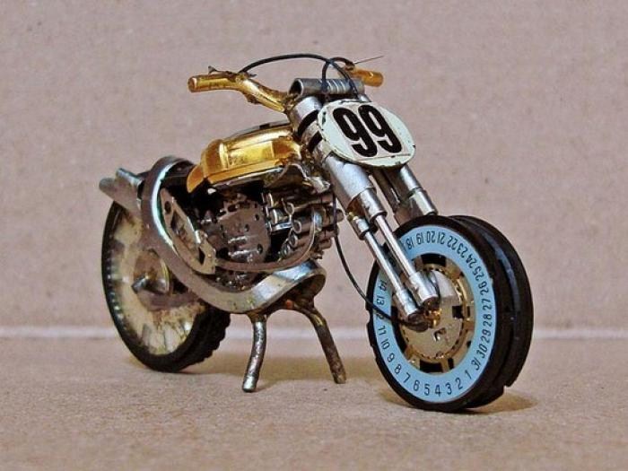 "У Жозе Пфау есть друг, владеющий небольшим магазинчиком с часами. И в этом магазине проходит небольшая акция -любому покупателю нужно принести свои старые часы взамен на первоначальный взнос для покупки новых. И вот однажды, навещая друга, и смотря на гору ненужных, но красивых часов, в голову Жозе пришла мысль смастерить что-нибудь из них. Так и родилась идея создавать интересные миниатюрные модели из наручных часов. В личной коллекции Жозе около 250 миниатюрных моделей мотоциклов. Пока они не продаются, но Жозе Пфау надеется когда-нибудь устроить аукцион.