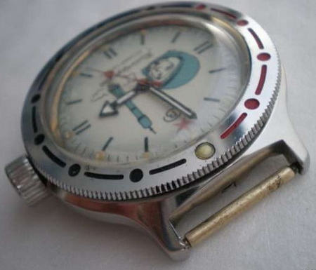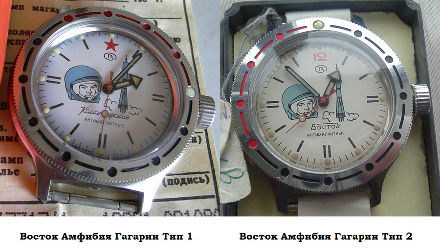 Предположительно, данные часы были выпущены к 30-летию полета Ю.А. Гагарина в Космос, к 12 апреля 1991 года, в амфибийном нержавеющем корпусе. Этот выпуск я условно назвал "Тип 1". Затем в 1992 году была выпущена еще партия таких часов, но уже с изменениями, которые коснулись только оформления циферблата. Часы этой партии я условно назвал "Тип 2". Различия между ними можно увидеть здесь: