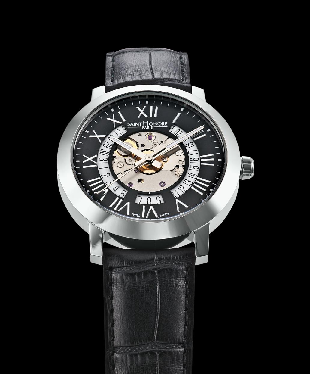Круглый корпус из полированной нержавеющей стали, диаметром 41 мм, водонепроницаемый до 50 метров. Заводная головка с логотипом Saint Honore на ее торце. Сапфировое стекло установлено на передней стороне корпуса и на его задней крышке. Циферблат черный, с открытой центральной частью (сквозь которую просматривается детали калибра), накладными римскими цифрами, а также с часовыми индексами, часовой и минутной стрелками, покрытыми белым люминесцентным составом.