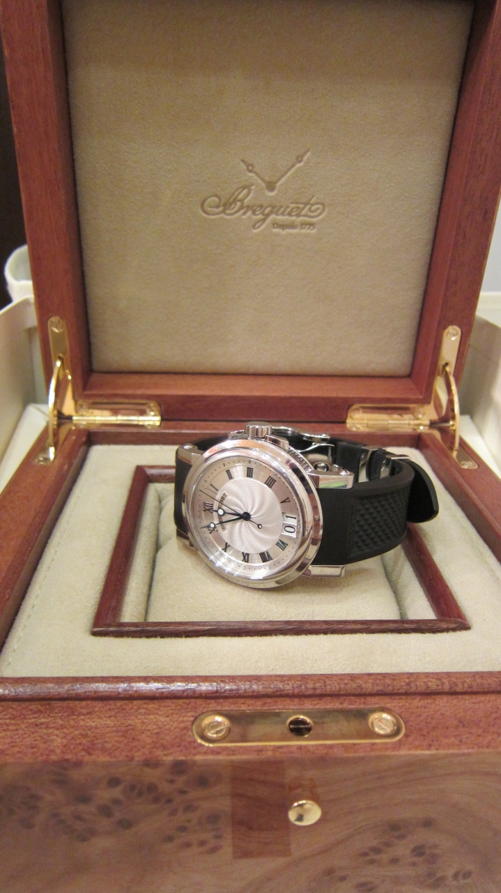 Автоматический механизм. Циферблат из посеребренного 18-каратного золота с гильошированным вручную узором. Часовая шкала с римскими цифрами Breguet и люминесцентными минутными метками. Большой указатель даты в положении "6 часов". Люминесцентные граненые стрелки Breguet с наконечником в форме яблока из вороненой стали. Задняя крышка из сапфирового стекла с гильошированным вручную узором. Запас хода 65 часов. Водонепроницаемость до 100 м.