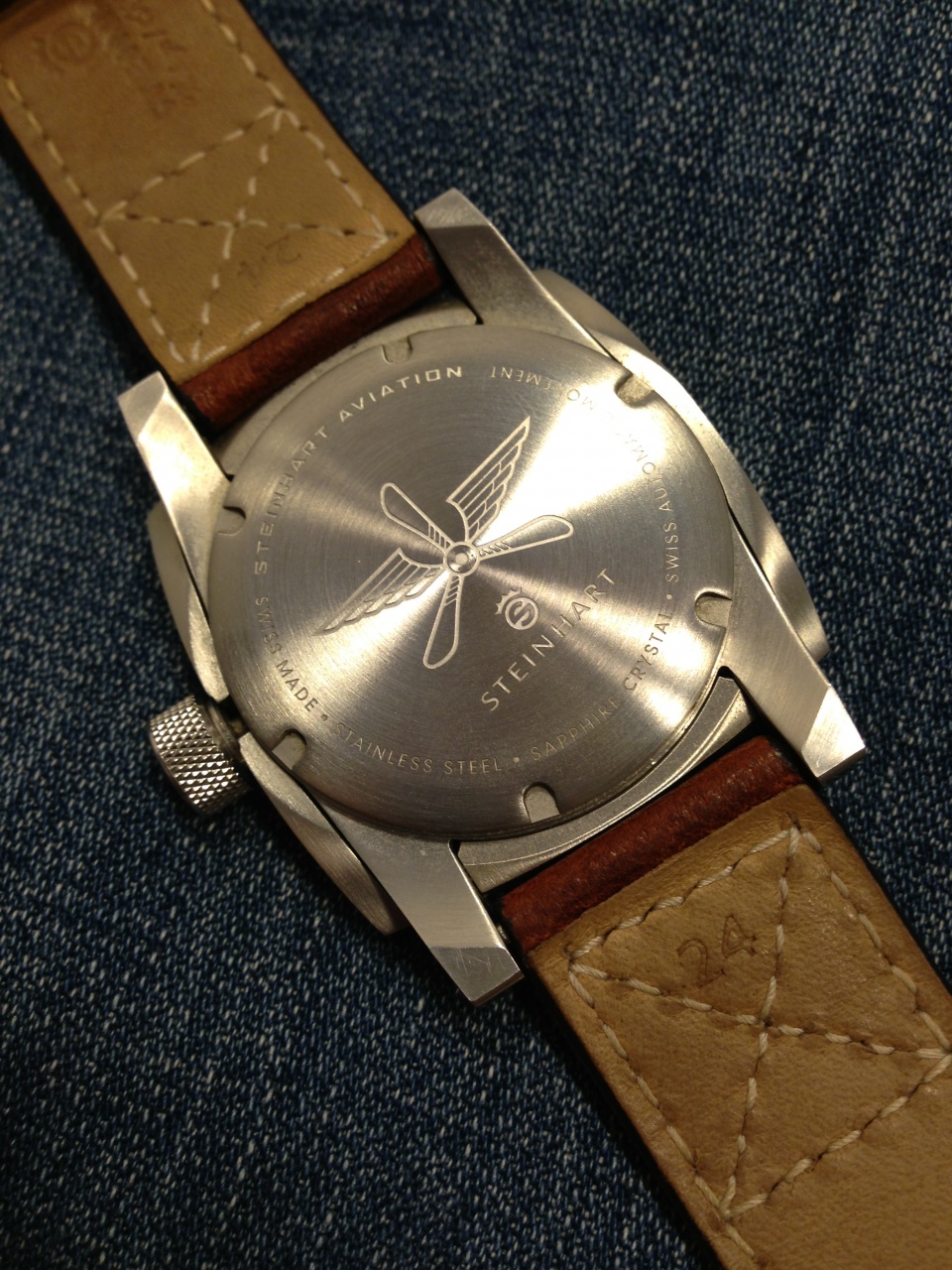 Часы на родном кожаном коричневом ремешке. Дополнительно отдам каучуковый ремешок: http://www.steinhartwatches.de/en/rubberstraps.html
