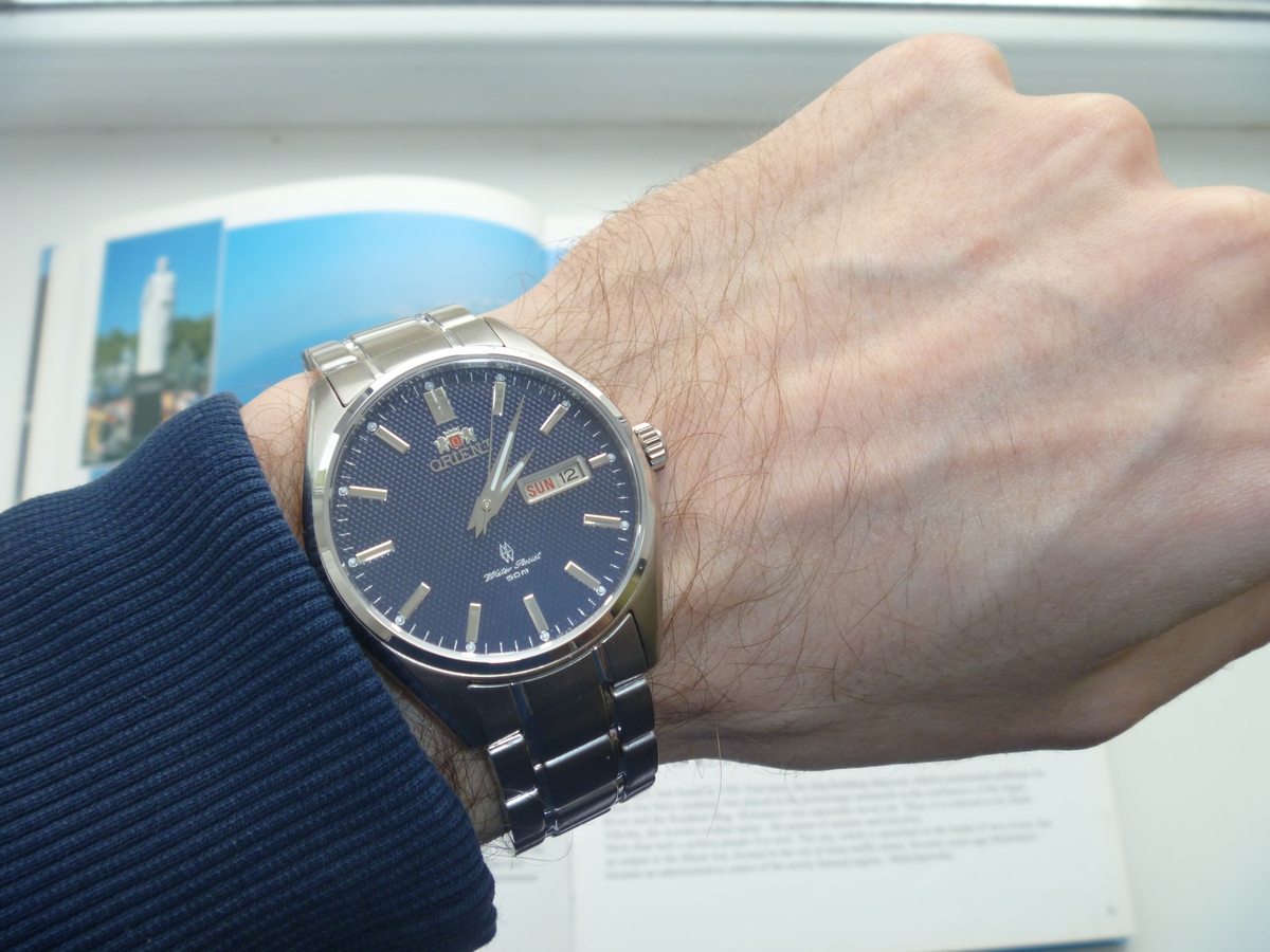 Небольшая предыстория покупки. Однажды зашёл в часовой магазин, и увидел рекламу casio edifice и технологии радио-синхронизации. Технологии casio произвели на меня большое впечатление. Я заинтересовался часами. После изучения edifisof перешёл к g-shock, потом к аналоговому кварцу, потом к механике, потом обратно к g-shock. И так несколько кругов. В промежутке купил недорогие электронные timex, чтобы понять буду ли вообще я носить часы. Незаметно пролетел год. Было потрачено очень много человеко-часов на просмотр форума, ebay, amazon и местных интернет магазинов, и посещение физических магазинов (очень полезно). Как правило останавливался на g-shock но всегда отталкивала стоимость. Перенастраивался на механику, но отталкивала точность. Единственное в чем определился точно - это в желании иметь аналоговый дисплей. На нном круге выбора часов остановился на casio gw-3000, которая на мой взгляд самая лучшая по совокупности красота/функции/стоимость. Хотел заказывать, но чувство, что меня обдирают остановило меня. Я задался вопросом - это технологии casio такие дорогие или все таки дерут. После изучения линеек g-shock MTG и MRG решил что дерут. И вообще забыл о часах. Однажды случайно примерял механику и в очередной раз задумался о механике. Супер точность редко нужна. Из моей практики: в конце смены люди идут в табельную за пропусками, раньше идти нельзя. Иногда начинается спор у кого часы точнее в котором побеждает не обладатель самых точных часов, а обладатель самого наглого характера. Самый большой фактор необходимости высокой точности - это отношение к этому фактору. Можно представить, что каждую неделю нужно подстраивать часы, и это представится большой обузой. А можно посмотреть на это с другой стороны и представить, что раз в неделю нужно уделить своим любимым часам немножко внимания и позаботится о них. Для себя решил, что точность все таки относительна и взялся за поиски механики. В механике я разбирался. Больше всего мне нравились Rolex Air King: простым дизайном подходящим как мне кажется под любую одежду. Этакая ровная классика. Денег таких нет, за брендом никогда не гонюсь, только за качеством. Поэтому Orient. Из-за бугра заказывать не хотелось, да и цены на ebay и amazon мне показались не намного ниже. Пару дней поисков, и я нашёл их у одного продавца в интернете. На следующий день заказал, оказалось что успел забрать последние.