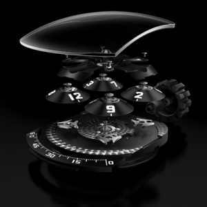 Особенности: Тройные мосты в черном цвете ARCAP P40; отображение времени часовыми шестернями, которые поворачиваются с управлением от контрольной панели Geneva; титан 5 Уровня; индикатор резерва питания; 15-минутные и секундные циферблаты для точной настройки времени; заводная головка для точной настройки.