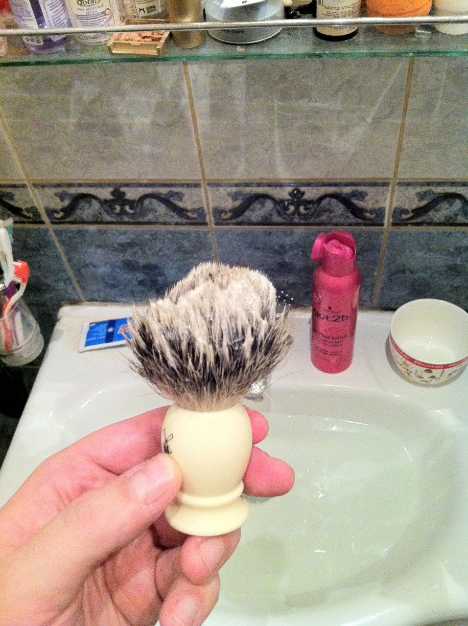 Приветствую Господа. Прошло 2 дня, а значит что? Значит сегодня, в целях чистоты эксперимента я бреюсь 41 + персона. Началось все как обычно- горячий душ, максимальное распаривание+ прешейв прорасо+смывание+ еще раз распаривание. Далее греем чашку и помазок, происходит это так