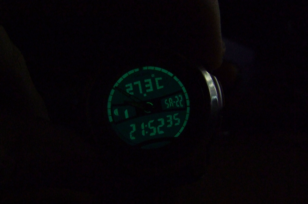 Часики обладают термометром, правда, чтобы он показывал температуру окружающей среды, их надо снять на пол часа, так даже в инструкции написано. Есть еще авто включение подсветки при наклоне руки к себе, правда функция отключается через несколько часов сама, ну полный автомат. Приливы, отливы и фазы луны мне как то по барабану. Все остальные таймеры и будильники тоже нафиг не нужны.