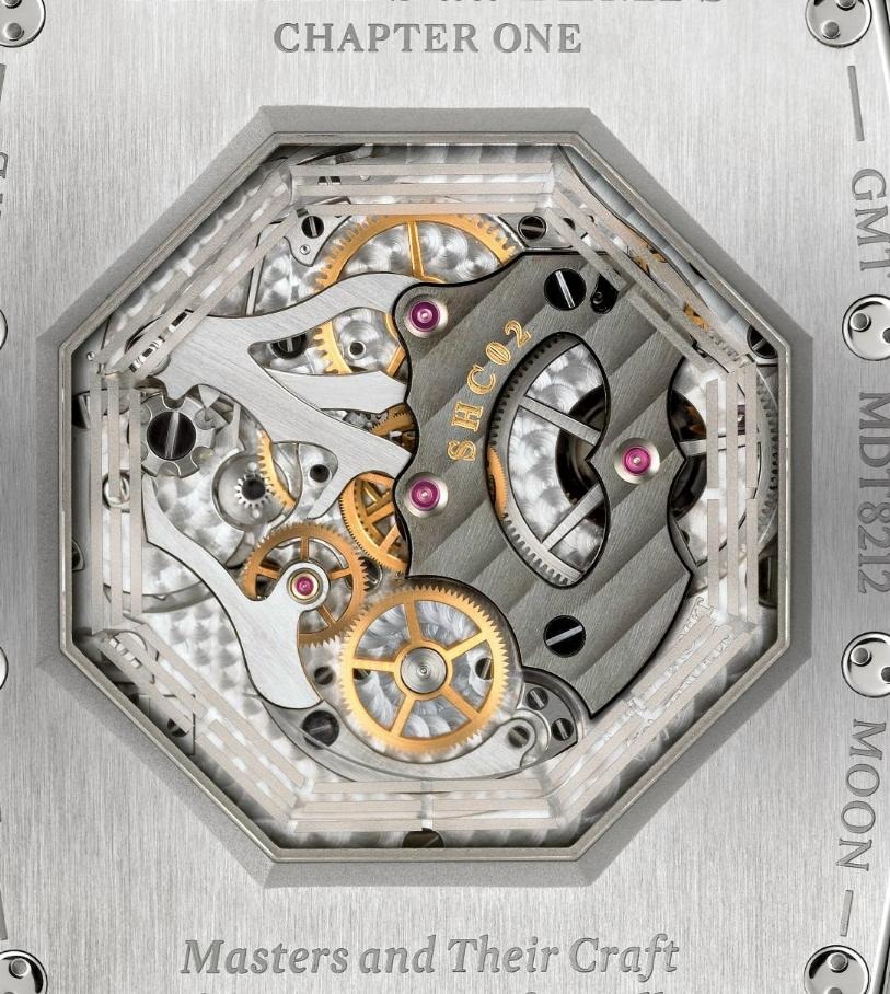Модель оснащена швейцарским механизмом с ручным заводом Maîtres du Temps MDT SHC 02.1, состоящим из 558 деталей, на 58 камнях, с балансовой частотой 21600 полуколебаний в час (3 гц) и запасом хода 60 часов. Набор функций калибра впечатляет: индикация часов, минут (посредством соответствующих центральных стрелок), даты (посредством соответствующего аналогового ретроградного указателя, расположенного на 3 часах), времени GMT (посредством соответствующего аналогового ретроградного указателя, расположенного на 9 часах), дня недели (посредством соответствующего указателя в виде вращающегося ролика с нанесенными на него наименованиями дней недели, расположенного в нижней части корпуса), фаз Луны (посредством соответствующего указателя в виде вращающегося ролика с нанесенными на него изображениями Луны, расположенного в верхней части корпуса), а также с хронографом (центральная секундная стрелка красного цвета и 60-минутный счетчик хронографа, расположенный на 12 часах) и турбийоном, каретка которого расположена в круглой апертуре на 6 часах). Калибр отлично отделан и декорирован.
