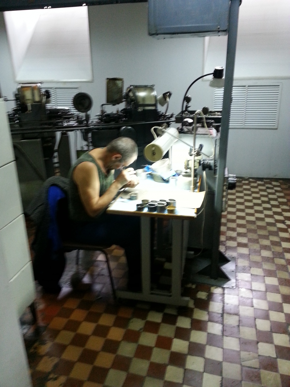 Или "полировка корпуса":на деревянную палку насаживается несколько не обработанных корпусов и сотрудник наваливается всем телом на войлочный круг, дожидаясь блеска заготовки, которые складываются в ровные горки.