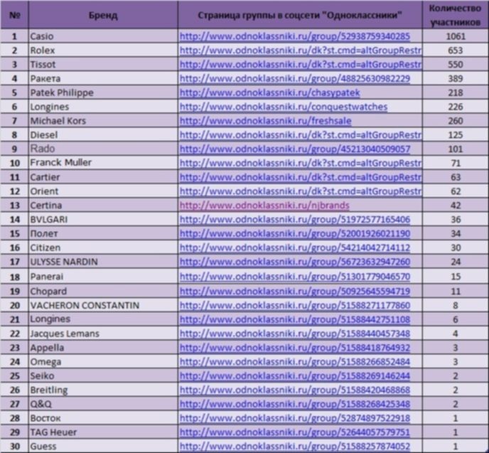 Поскольку социальная сеть "Одноклассники" является одной из самых многочисленных в мире, она считается прекрасным инструментом для анализа популярности чего-либо, в данном случае – брендов часов. Для определения самого популярного бренда среди пользователей "Одноклассники.ру" аналитики "Биржевого лидера" составили список групп, тематика которых посвящена исключительно конкретным брендам, после чего отсортировали его по количеству участников.