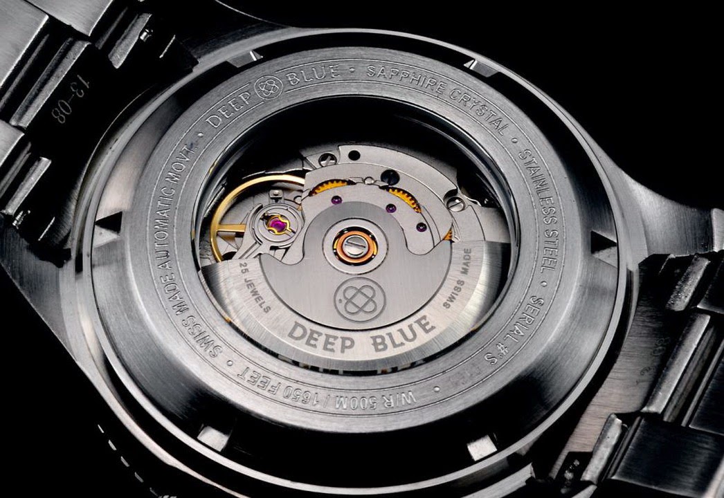 Новая дайверская модель Swiss Ocean DIVER 500 от американской часовой компании, расположенной в Нью-Йорке, Deep Blue имеет круглый корпус, изготовленный из сатинированной нержавеющей стали, диаметром 45,0 мм, водонепроницаемый, как это и следует из названия модели, до 500 метров. Вращающийся однонаправленный дайверский безель с сапфировым покрытием черного цвета. На торце завинчивающейся защищенной рифленой заводной головки, расположенной на 3 часах, выгравировано изображение эмблемы бренда DEEP BLUE. Сапфировое стекло установлено на передней стороне часового корпуса (с антибликовым покрытием) и на его завинчивающейся задней крышке. Циферблат черного цвета, отделанный горизонтальной волнистой гравировкой, с накладными часовыми индексами и стрелками, покрытыми люминесцентным составом SuperLuminova белого цвета. На противовесе секундной стрелки имеется объемное изображение эмблемы бренда DEEP BLUE.