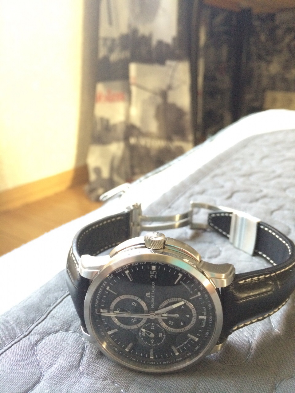 Chronographe Valgranges. хронограф с 30-ти минутным и 12-ти часовым счетчиками, вынесенная секундная стрелка, интегрированная откидная система для активации встроенных кнопок, сапфировая задняя крышка