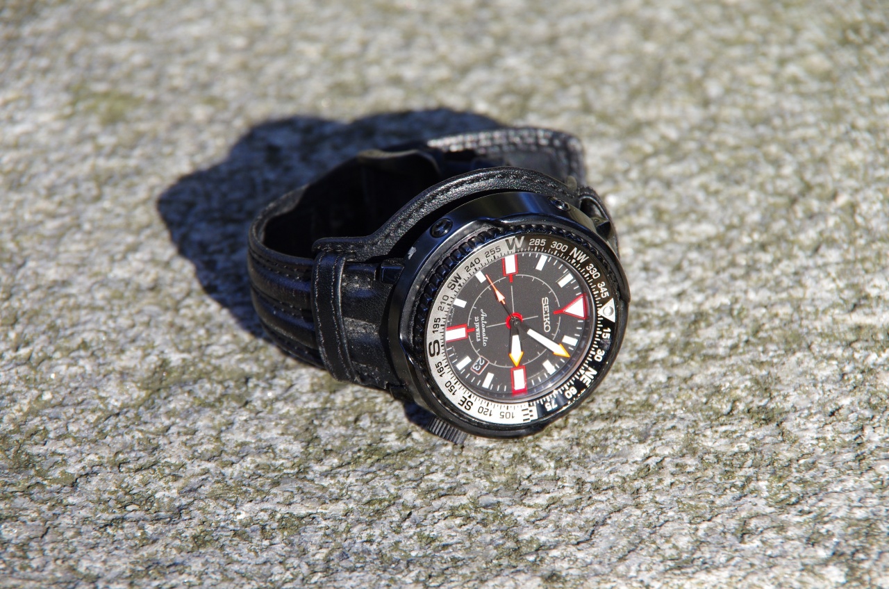 Собственно о предмете: она из моделей SBDC021 MIJ - механика со старым добрым 6R15, чёрный металический корпус с твёрдым покрытием, сапфировое стекло, чёрный кожанный ремешок, и всё это упакованно в коробку, стилизованную под футляр пистолета.