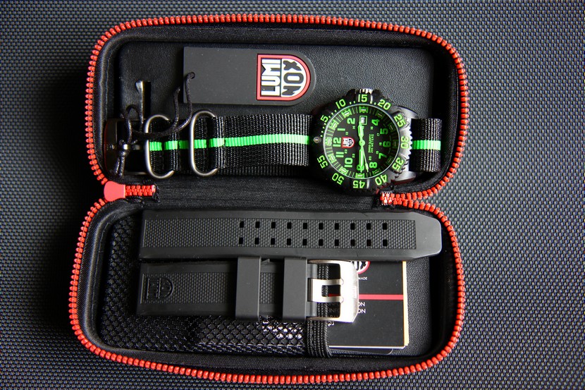 В комплекте два вида ремешка, резиновый (чёрный) и нейлоновый NATO (чёрный с зелёной полосой).