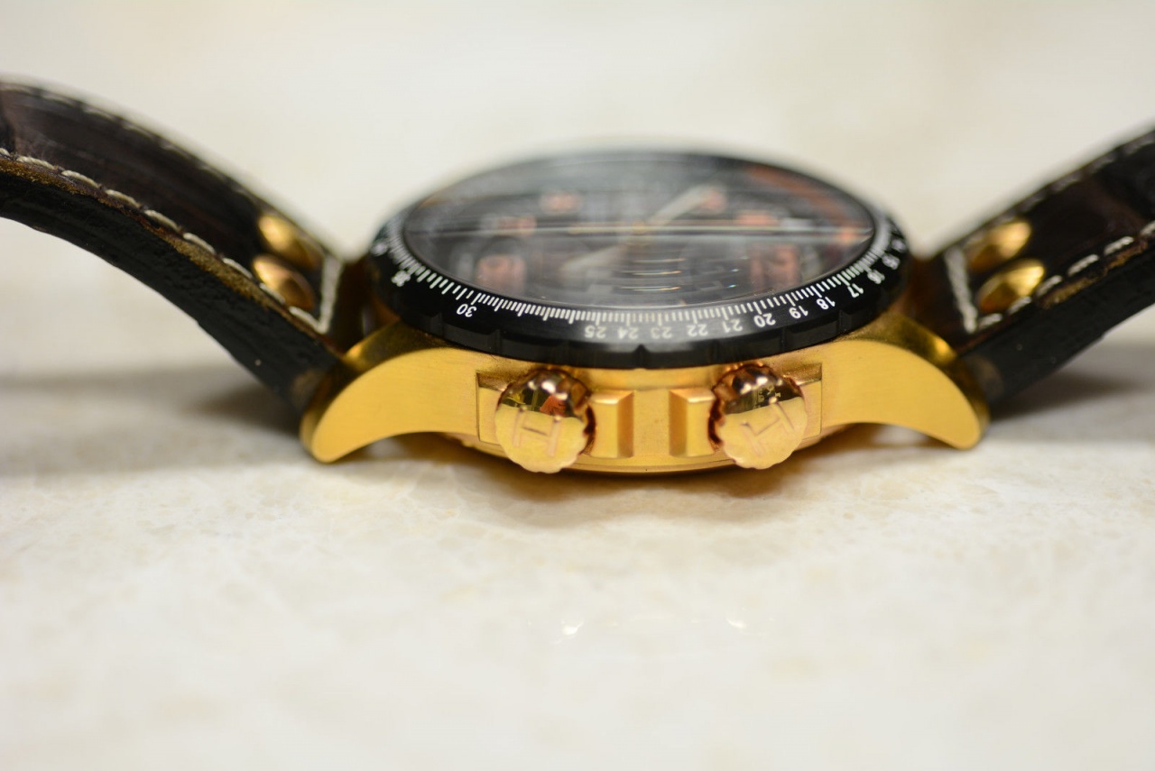 Позолоченный корпус из нержавеющей стали (10 микрон) | Ø = 44 мм | Толщина = 15,8 мм | сапфировое стекло | водонепроницаемость до 10 бар