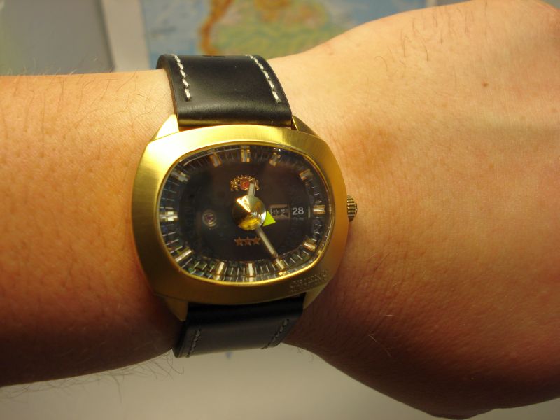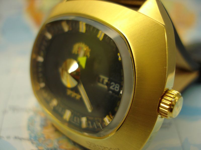 Трехстрелочник, секундная стрелка в виде треугольника носится по кругу. В центре стекла визуально коническая нашлепка, которая на самом деле изнутри, коническое глухое отверстие заполненное отражающей массой.