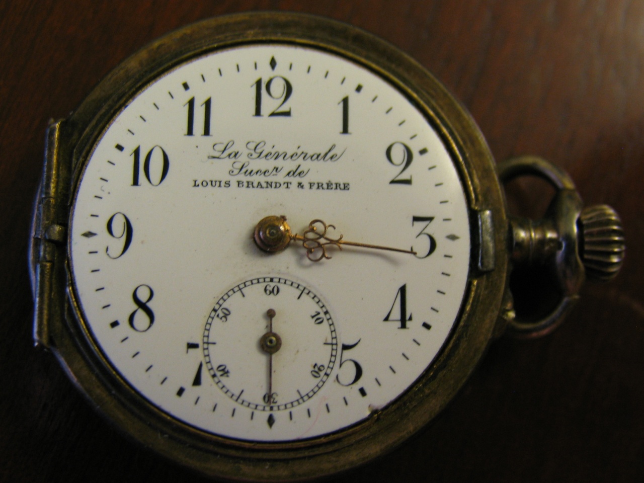 Мне по наследству перешли часы фирмы Louis Brandt & Frere. Состояние довольно печальное. Отсутствует часовая стрелка, стекло, отломана передняя крышка. Механизм работает. Часы тикают