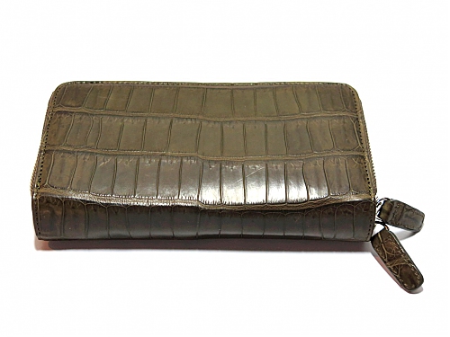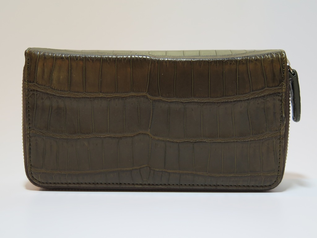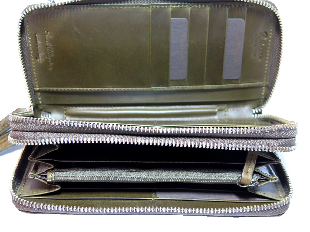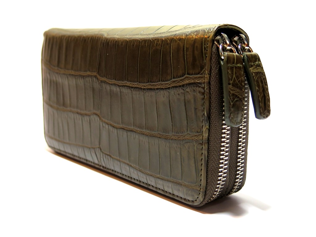 Мужской клатч ручной работы «Brianza» из 100% кожи миссисипского аллигатора высочайшего качества выделки, окрашенной вручную в редкий цвет «Морёный дуб» (болотно–зелёный). Клатч застегивается на две серебристые молнии с бегунками из кожи аллигатора и имеет три больших отделения для банкнот, отделение для ручки, 24 отделения для кредитных карт или визиток, три отделения для паспорта, водительских прав и других документов, и отделение для монет, застегивающееся на молнию. Внутри клатч отделан телячьей кожей болотно–зелёного цвета. В клатч можно дополнительно положить смартфон, ключи от автомобиля и другие небольшие предметы.