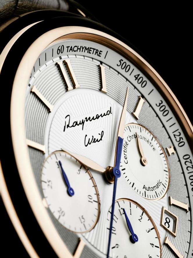 Круглый полированный корпус, изготовленный из 18-каратного розового золота, диаметром 45,0 мм, толщиной 11,8 мм, водонепроницаемый до 50 метров. На торце рифленой заводной головки, расположенной на 3 часах, выгравирован логотип бренда Raymond Weil. Пушеры хронографа размещены на 2 и 3 часах. Сапфировое стекло установлено на передней стороне часового корпуса (с антибликовым покрытием) и на его завинчивающейся задней крышке. Циферблат серебристого цвета, гильошированный, с накладными часовыми индексами, золотыми часовой, минутной и секундной стрелками, а также с воронеными хронографическими стрелками. На фланце расположена круглая тахиметрическая шкала.