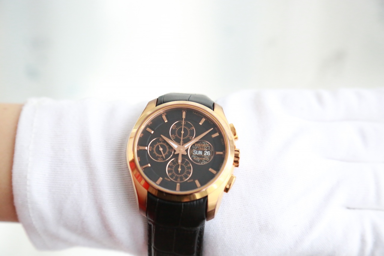 Часы куплены в августе 2013 г., находятся на гарантии до августа 2015 г. По техническому состоянию никаких вопросов, все работает как положено. Теперь по внешнему виду: часы эксплуатировались ежедневно, как при нормальной носке на работе в офисе, так и на отдыхе. В связи естественным износом, осенью 2014 года, ремень был заменен на новый оригинальный у официалов. После установки нового ремня, часы носились не более 2-х недель, далее лежали без дела. На часах есть следы носки, в виде микроцарпинок, а так же, потертостей покрытия PVD, что особо заметно по заводной головке, кнопкам хронографа, "граням" безеля и торцам "ушек", между которыми закреплен ремень, сколов нет, по стеклу никаких нареканий. Хочу сказать, что все эти недостатки заметны при близком осмотре часов, с расстояния менее 50 см. При повседневной носке на руке, описанные следы износа не заметны, зато сами часы смотрятся очень солидно и я бы сказал, благородно, в некотором даже роде "винтажно" =)