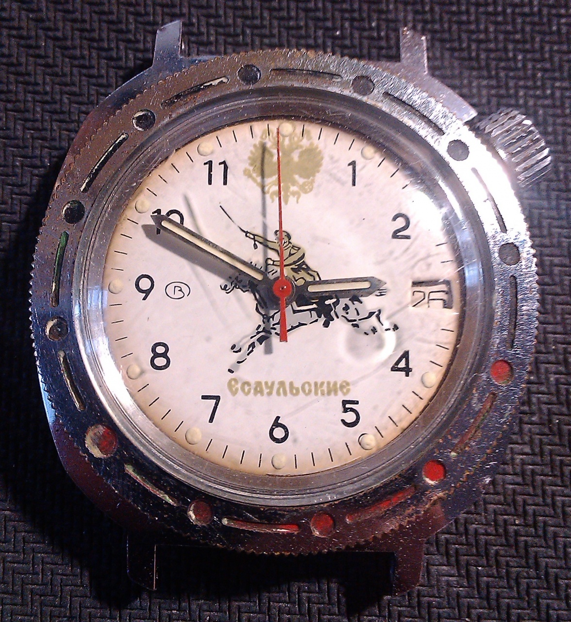 . в принципе ни чего необычного. герб России и надпись Есаульские, на мой взгляд, немного блеклые. или выгорели. мотор 2414, без фасок, грубо обработан, скорее всего середина 90-х? корпус так и не определил. если смотреть на футор для ЗГ, скорее всего покрыт хромом? с другой стороны, есть след от удара и глубоких царапин, желтизна не проглядывает, может стальной? делали ли их, стальные, в 90-х? стекло довольно амфибийное, толстое. задняя крышка тоже без изысков, не измерял, но похожа по толщине на амфибийную, это если пальцами...