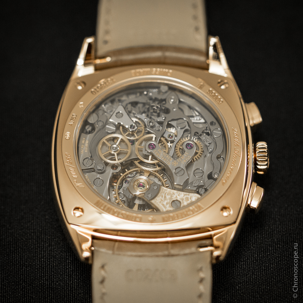 С тыльной стороны открывается завораживающая картина: сложнейшая колесная система, по периметру которой описывает окружность золотой инерционный груз, украшенный гравировкой. Обратите внимание, что колонные колеса хронографа декорированы мальтийскими крестами. А на корпусе и одном из мостов механизма (Caliber 3500) поставлены женевские клейма, свидетельствующие о высочайшем качестве отделки часов.