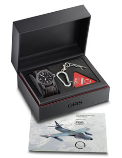 Часы Oris Swiss Hunter поставляются в великолепной коробке, в которой, кроме часов, находится оригинальный брелок для ключей из предохранительного кольца катапультируемого кресла самолета Hawker Hunter jet.