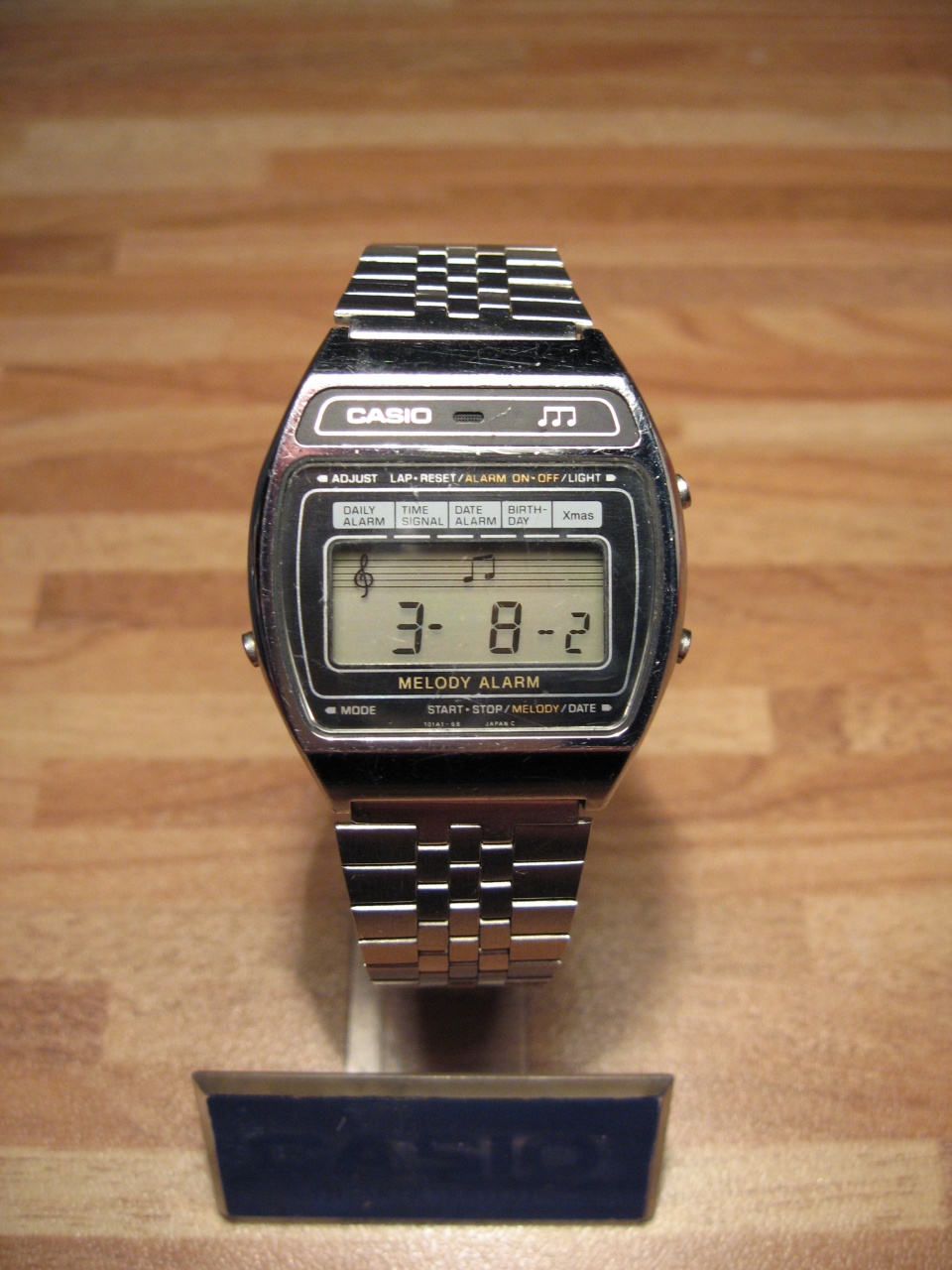Casio M-1230 - одна из оригинальных и музыкальных моделей славных 80-х. У неё всё очень музыкально, от нажатия кнопки до звукового сигнала. Переключение из режима в режим сопровождается звучанием двойных восьмых нот (ДО-РЕ, МИ-ФА и т.д.). Что касается мелодий, всего их одиннадцать. Семь на каждый день недели, одну из 2-х можно поставить на конкретную дату, Happy Birthday звучит на день рождения и Jingle Bells на Рождество.