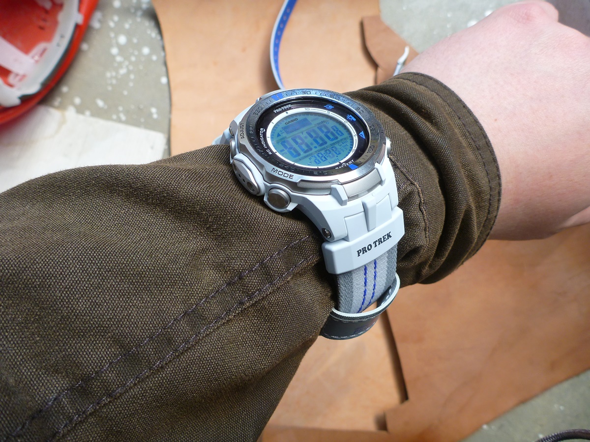 PRW-3000G-7DR - это белый протрек, точнее немного серенький с синими элементами. Фотографий в сети совсем мало, только две протокольные везде, поэтому думал, что у них основной ремешок будет из двух частей, как у остальных. А оно вон как оказалось – ремешок простой и приподнимает часы над рукой, а я 3000 выбирал как раз из-за малой толщины. Придется смириться с данным фактом, т.к. отдельно белых двойных ремешков не бывает, если только на титановый разориться. Ремешок виниловый, многослойный; с металлическими люверсами, достаточно легко пролезает в проушинки.