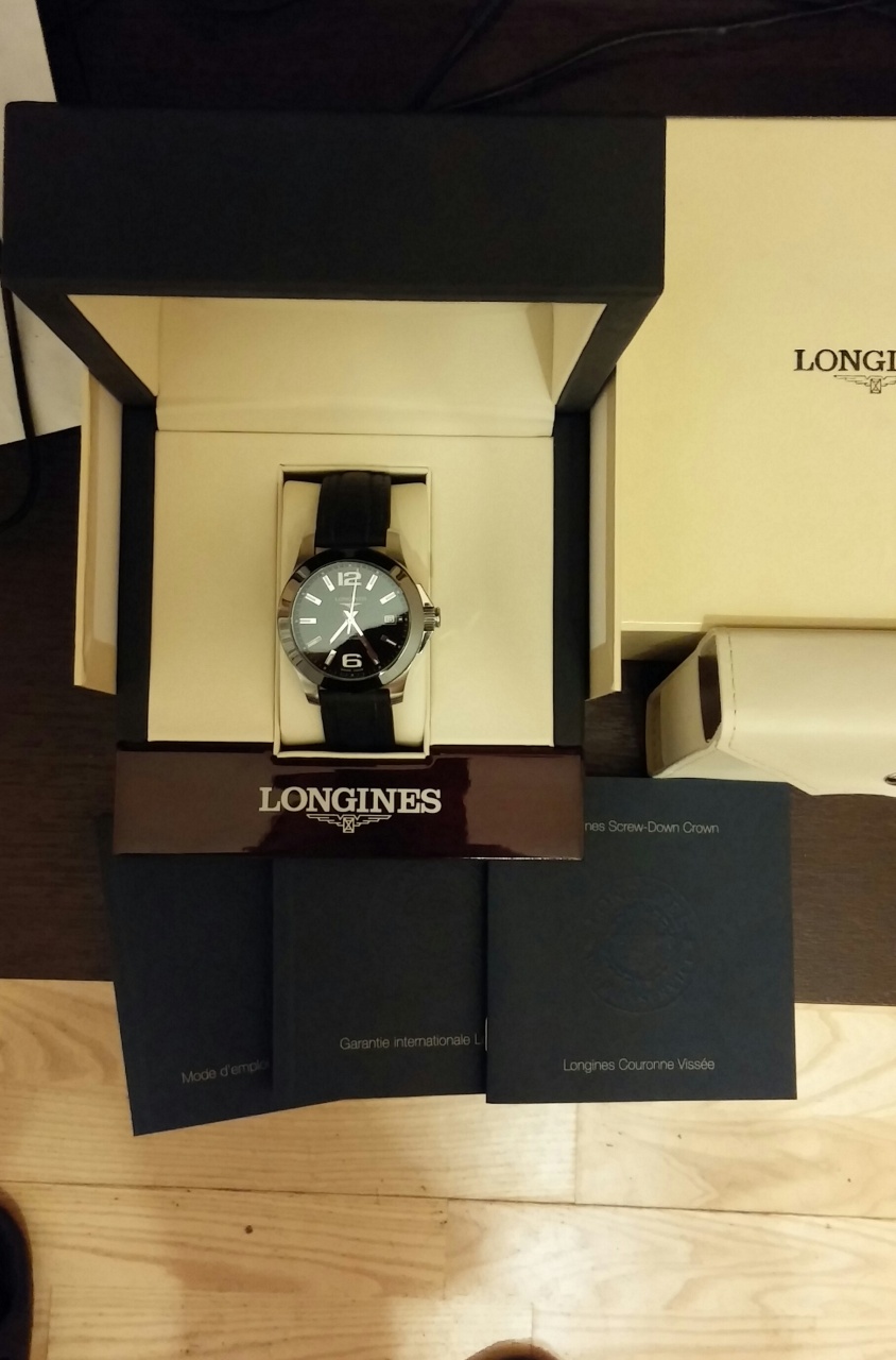 Предлагаю Вашему вниманию самую на мой взгляд не убиваемую модель с керамическим безелем Longines Conquest L3.655.4.56.0. Состояние поставил хорошее,т.к по бокам на корпусе есть микроцарапины. Лицо часов,а именно безель и стекло в идеале. Все посторался отобразить на фото. Ремень не оригинальный,но прослужит еще долго. Оригинальная застежка есть. Так что ремень легко поменять. Полный комплект: две коробки, инструкции и самое главное. Не заполненная гарантийная карта. Так что получается,что данный экземпляр имеет вечную гарантию от Longines. Теперь о часах. Механика с автоподзоводом. Калибр L633 на базе ETA 2824.2. 28800 полуколебаний в час. На 25 камнях. Резерв хода 38 ч. Посеребренные стрелки и метки. Лаковый черный циферблат. Корпус сталь с керамическим безелем. Стекло сапфир с антибликом. Водозащита 300 м. Универсальный размер 41 мм. Завинчивающаяся задняя. крышка и заводная головка. Функции: часы,минуты, секунды, дата. Читаемость превосходная. Ничего лишнего. Часы подойдут под любой стиль одежды. Обмен не интересен. Торг возможен. Отправлю курьерской службой куда угодно. Все вопросы и предложения в личку.P.S. Цена на данную модель в часовых салонах 93900 р. Моя цена меньше на 60% , всего 37500 р. И не забудьте про гарантийный карту.