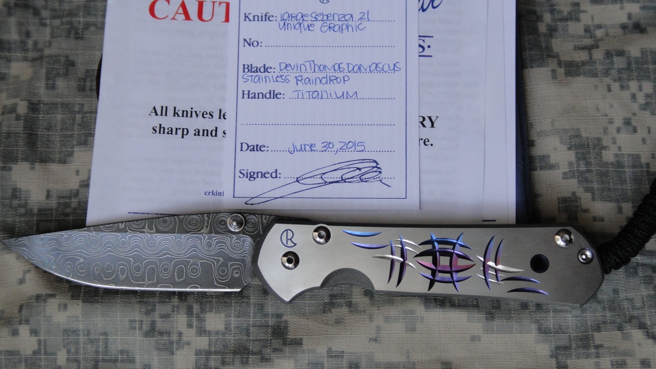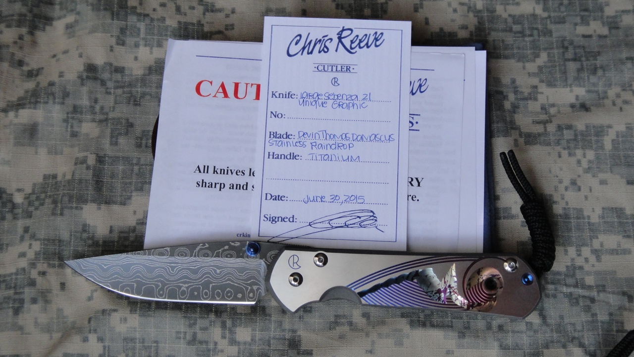 Chris Reeve Large Sebenza 21 Knife Unique Graphic (Raindrop Damascus) Эксклюзивная модификация, которая отличается от обычной Large Sebenza 21 уникальным рисунком Unique Graphic на рукояти. Рисунок выполняется без использования красок методом анодирования титана. Клинок ножа выполнен из нержавеющего дамаска с рисунком Raindrop, который изготавливает знаменитый американский кузнец Девин Томас (Devin Thomas).