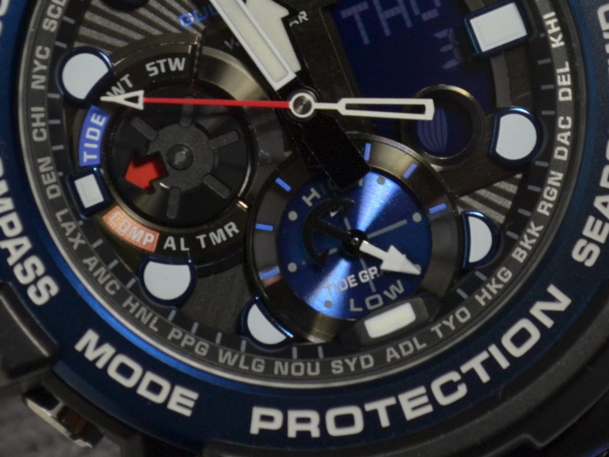 Начинка модели достаточно функциональна, есть компас, термометр, фазы луны, график приливов и отливов, мировое время, будильники, секундомер.