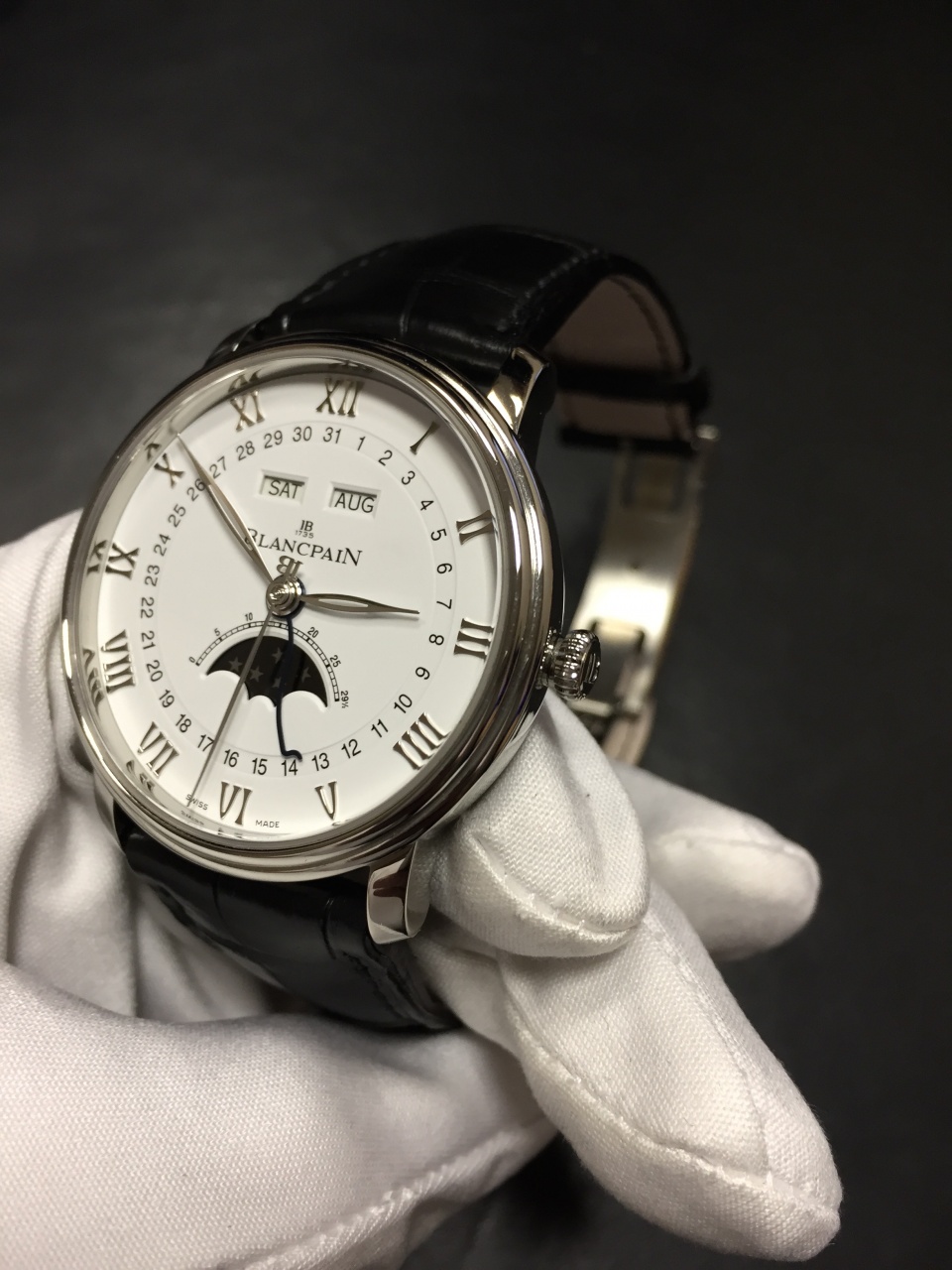 Описание: Мужские наручные часы Blancpain Villeret Moon Phase Complete Calendar представлены в 40-миллиметровом корпусе из нержавеющей стали. Это астрономические часы, которые способны уследить за движением небесных светил помимо солнца. Это хронометр, с помощью которого Вы сможете определять фазы Луны, время восхода и захода Солнца, а также наблюдать движение других планет и созвездий. Механизм автоматический, Калибр 6654 обеспечивает запас хода до 72 часов. Функции: часы, минуты, секунды, дата, день недели, месяц, фаза луны. Под ушками часов находятся специальные корректоры индикации. Водонепроницаемость составляет 30 метров. Модель поставляется на ремешке из кожи аллигатора с вставкой из нержавеющей стали, раскладывающаяся застежка.
