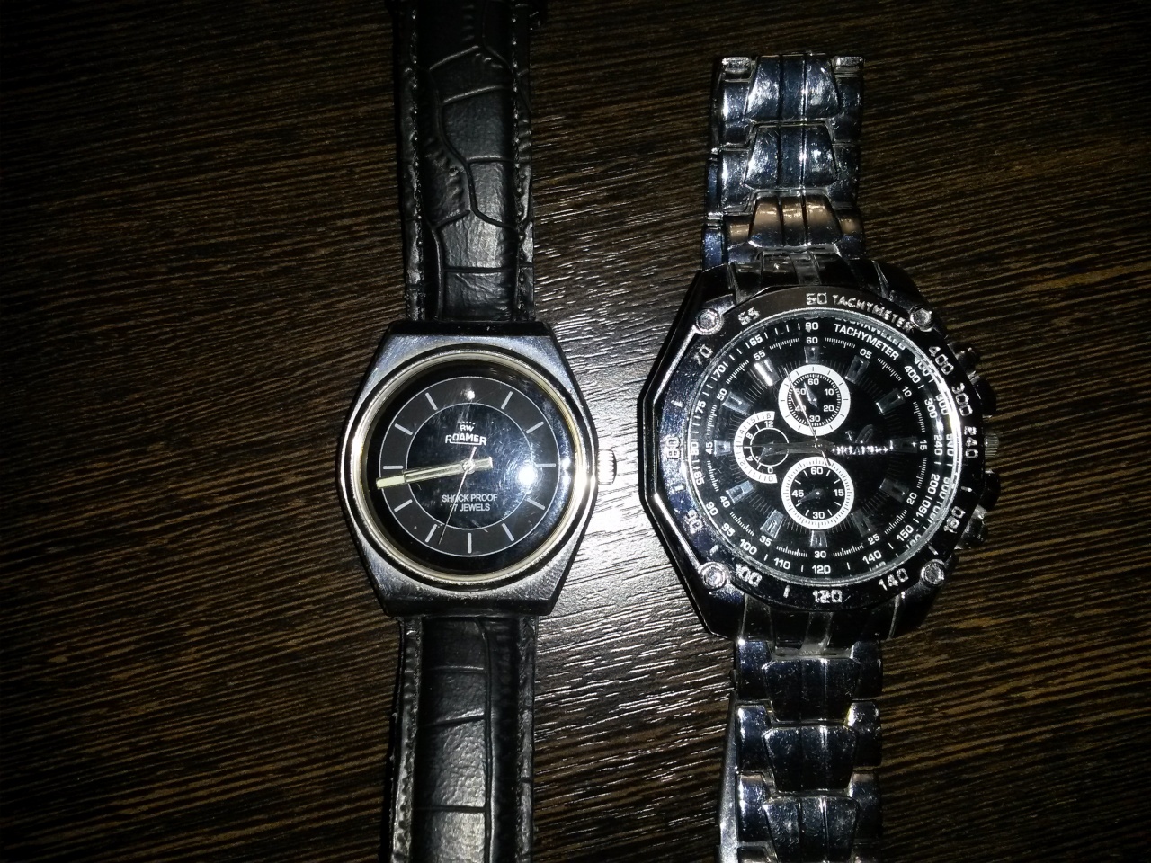 Большие серебристые, китай с ебея , ходят исправно и без проблем , состояние идеал , безель - маленькие циферблаты муляж . Типа роамер которые ходили идеально, достались б\у уже , брал их на рыбалку, но после месяцев 3х использования стали отставать . полез регулировать пошли нормально, щас опять ход не точный, уже не стал парится с ними тоже подарю , желательно одним комплектом может кому надо ?