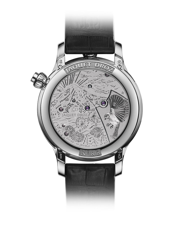 Дизайнеры Jaquet Droz предложили новую интерпретацию циферблата Grande Seconde и его культовой цифры «8». Верхняя часть «восьмерки» предназначена для отображения времени (часов и минут), а нижнюю, под куполом из сапфирового стекла, занимает автоматон в виде поющей птицы.